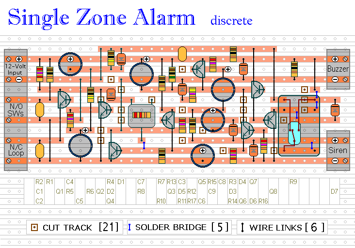 A single zone alarm circuit with entry and exit delay