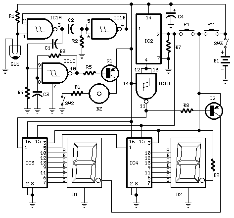 pulses counted by IC2. IC3 & IC4 divide by 10 each and
