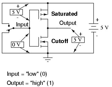 off and the lower transistor turning on when the input is "high" (1), and