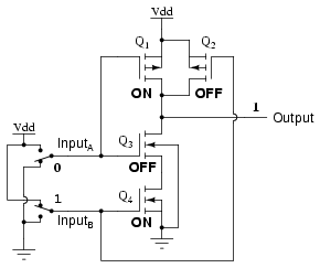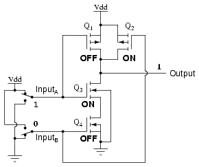 or input B are "high" (1), at least one of the lower transistors (Q3