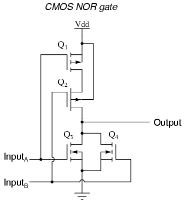 A CMOS NOR gate circuit uses four MOSFETs just like the NAND gate, except