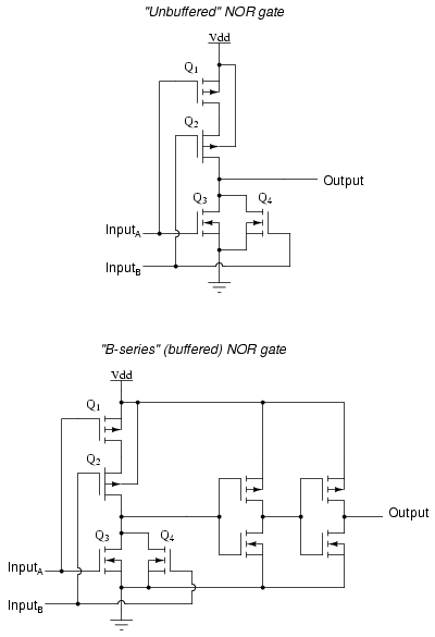 example, of an "unbuffered" NOR gate versus a "buffered," or B-series,