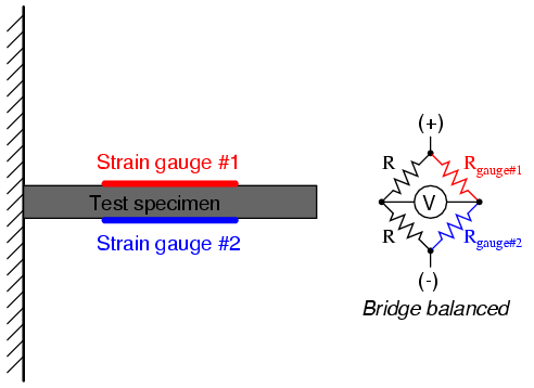 both strain gauges have equal resistance and the bridge