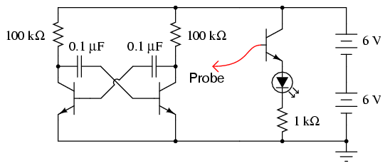 collector terminal of either multivibrator transistor.  You may notice that the LED fails to blink