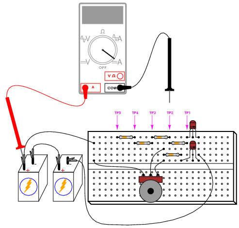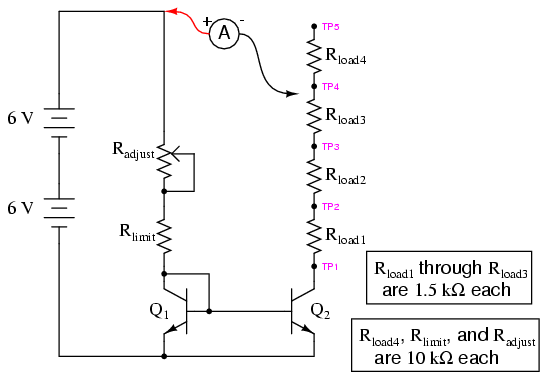 and consequently through Q2 as well.  Place the ammeter's black probe on TP1 and