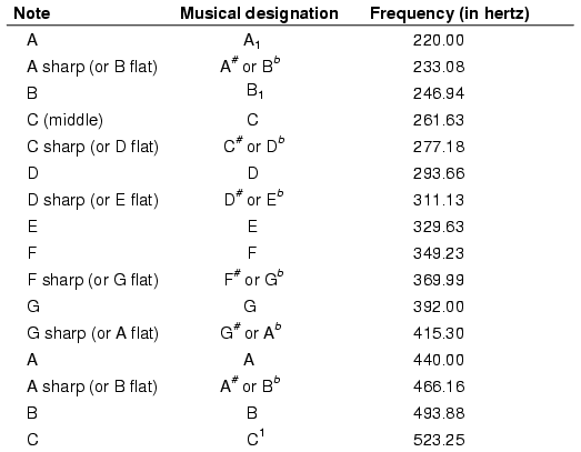 actual frequencies for a range of common musical notes: