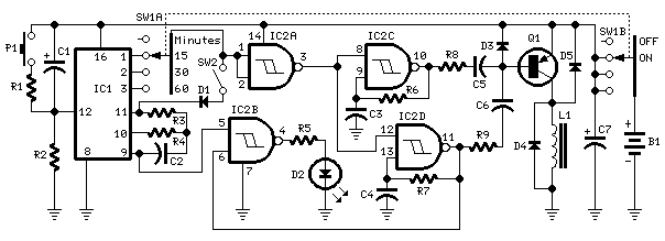 IC1, IC2A & IC2B form the timer section. C1 & R2 provide