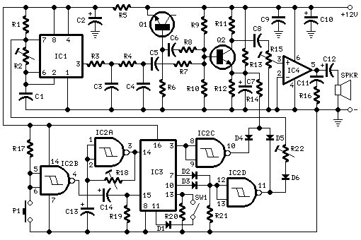 when SW1 is left open, and one-shot, when SW1 is closed.