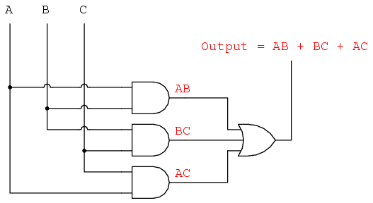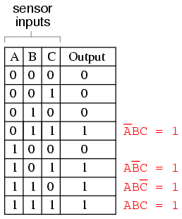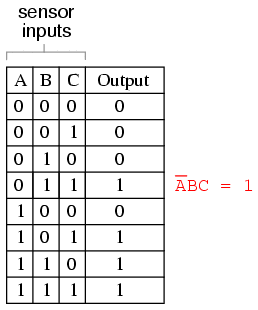 truth table for our two-out-of-three logic system, where A=0, B=1, and C=1,