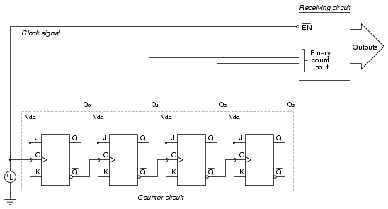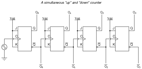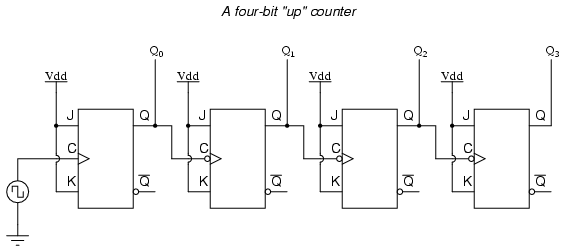 Counter circuits made from cascaded J-K flip-flops where each clock