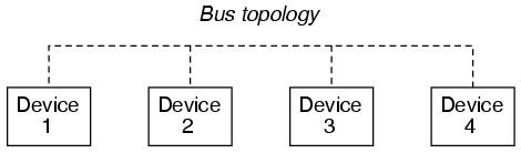 a "bus" topology but can also be implemented in a "star" or "ring" topology