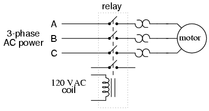 Shown here is a contactor for a three-phase electric motor, installed on