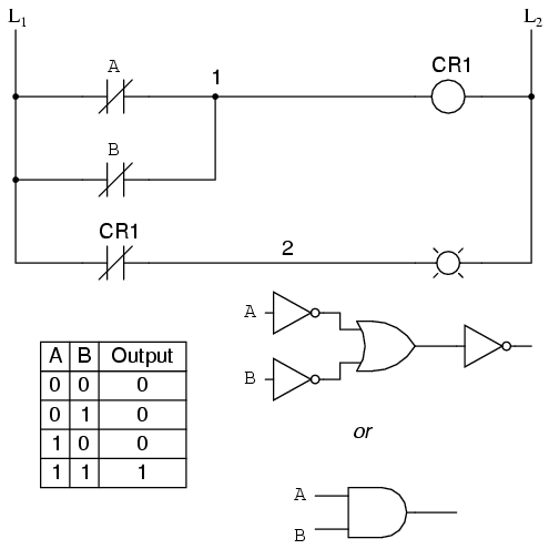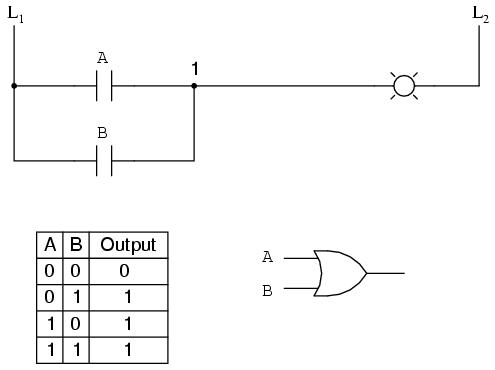 rungs at wire number 2 forms the equivalent of the OR gate, in allowing