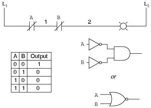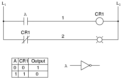 Normally-closed contacts are equivalent to a NOT gate (inverter).