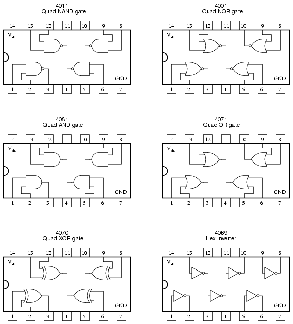 A few of the more common TTL "DIP" circuit packages are shown here for