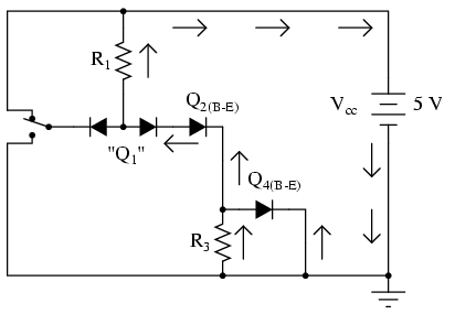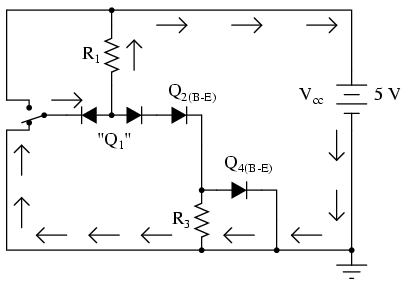 the right steering diode, Q2's base-emitter diode, and Q4's