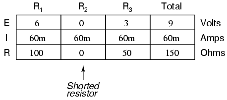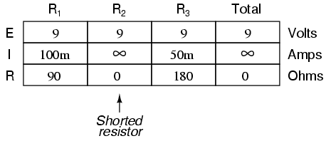 A shorted resistor (resistance of 0 Ω) would