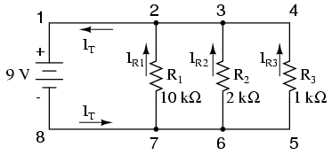 battery terminal at point 8 and travels through the circuit,