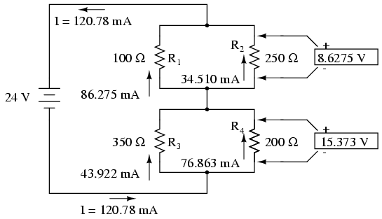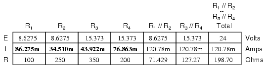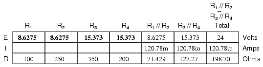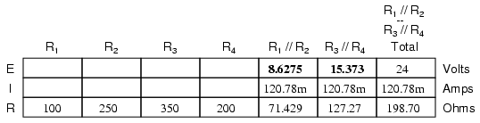 by applying Ohm's Law (I=E/R) to the "Total" column in the