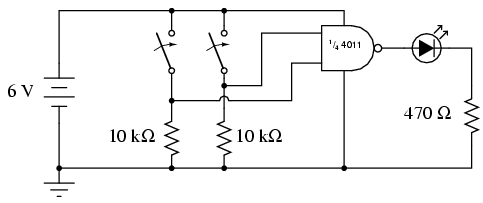 tested with two switches, two pulldown resistors, and an LED